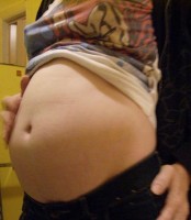 The guy was really pregnant. His flannel shirt was clearly a paternity top as it hugged his slender shoulders, tiny arms and huge belly. It might sound cliché but it looked like he swallowed a watermelon. The belly started at the bottom of his ribs and jutted out quite harshly and rounded very close to his groin in his low rise jeans.